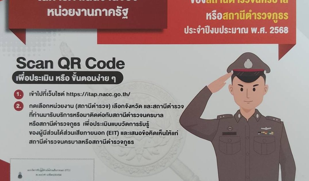 สถานีตำรวจภูธรดงป่าคำ ขอเชิญชวน ผู้มารับบริการ / มาติดต่อ สถานีตำรวจ ร่วมประเมินแบบวัดการรับรู้ของผู้มีส่วนได้ส่วนเสียภายนอก (External Integrity and Transparency Assessment: EIT) สำหรับนำไปพัฒนาปรับปรุงการให้บริการของสถานีตำรวจ